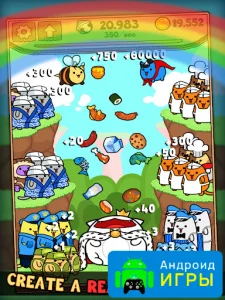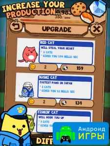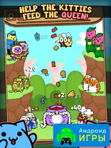 Играть можно при помощи одного касания, поэтому управление здесь достаточно простое и лёгкое. Нужно нажимать на дисплей, чтобы нанимать котов и менять параметры. И просто тапайте по экрану, когда будет производиться кормёжка королевы: чем быстрее будут совершаться нажатия, тем скорее котики будут закидывать пищу огромной кошке в рот.