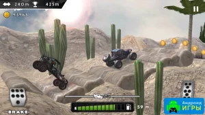 Управление предельно понятное: газ и тормоз находятся по краям экрана, а внизу — индикатор уровня топлива. Интерфейс интуитивен, что делает игру доступной как для новичков, так и для опытных гонщиков.