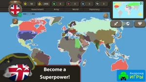 Можно выбирать союзников и врагов, но максимально тщательно. Также конкурируйте с государствами и принимайте разные решения. Но об их правильности можно узнать только спустя конкретный временной промежуток. Защищайте свои территории от других стран и нападайте на врагов. Тут также можно заключать соглашения и участвовать в мировых событиях, в которых нужно постараться получать максимальную выгоду.