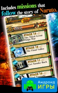 Игрокам предоставляется возможность формировать отряд из легендарных героев одноимённого аниме и бросать вызов сильнейшим врагам. Каждый персонаж обладает уникальными приёмами, которые можно улучшать по мере прохождения. Чтобы расширить команду и усилить её боевой потенциал, придётся зарабатывать внутриигровую валюту, а сделать это можно только побеждая соперников. Используйте все доступные навыки, комбинируйте атаки и продумывайте каждый ход, чтобы лишить противника шанса на ответ. Постепенно, побеждая в боях, вы будете подниматься в рейтинговой таблице и завоёвывать репутацию одного из лучших ниндзя в мире. Ваша цель заключается в том, чтобы стать сильнейшим в Конохе.Атмосферная подача