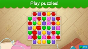 - Прохождение множества уровней в стиле «три в ряд»;