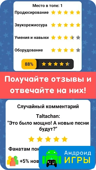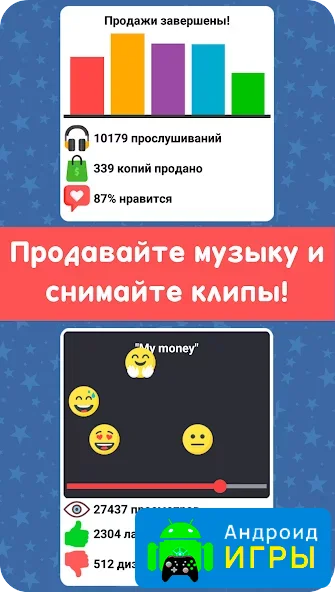 Графика в игре выполнена в простом, но приятном стиле с поддержкой HD-качества. Всё представлено в формате 2D, а управление сделано максимально удобным и понятным. Симулятор можно назвать кликером, ведь многие действия выполняются в один тап, что делает процесс лёгким и доступным. Несмотря на минималистичные спецэффекты, игровой процесс выглядит красочно и увлекательно, а сама атмосфера отлично передаёт дух музыкальной индустрии.Почему стоит попробовать