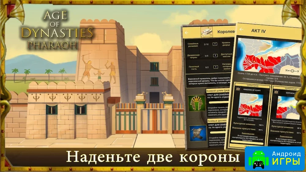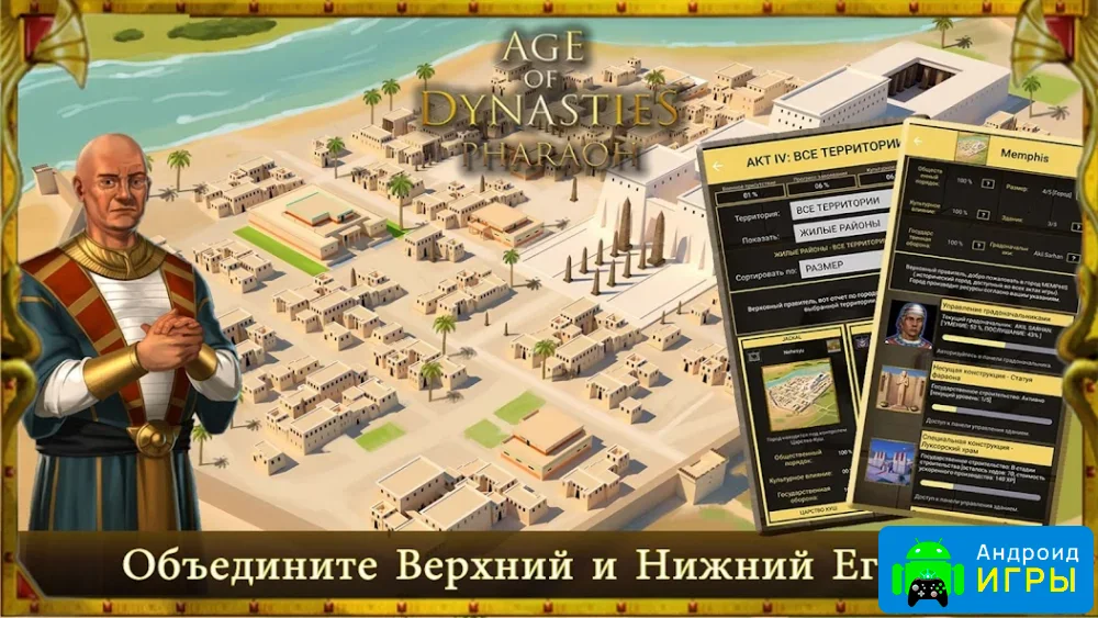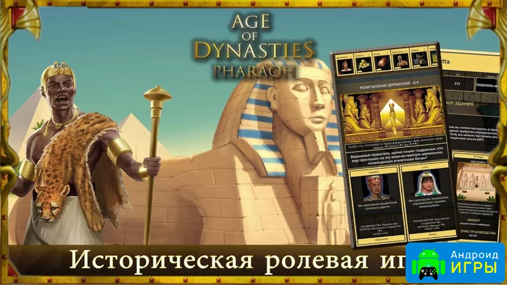 Age of Dynasties: Pharaoh для Android — это захватывающая стратегия, которая перенесет игроков в древний Египет, эпоху фараонов и великих цивилизаций. Здесь вам предстоит стать правителем Египта, управлять его ресурсами и вести страну к процветанию, одновременно формируя собственную династию. Вы не просто временный правитель — ваша цель создать наследие, которое перейдет вашим преемникам, сохранив богатства и власть на поколения вперед.
