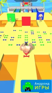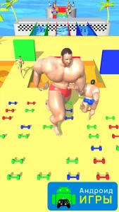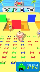 Для этого необходимо оставить блок и исследовать игровую локацию, собирая гантели того же цвета, что и ваш блок. Каждая поднятая гантеля увеличивает силу персонажа и визуально меняет его тело — он становится сильнее и более мускулистым. После того как накоплено достаточно силы, можно вернуться к блоку и продолжить его передвижение к финишу. Этот цикл — сбор гантелей, рост мышц, движение блока — повторяется до тех пор, пока блок не достигнет конечной линии, а ваш герой не превратится в настоящего атлета.