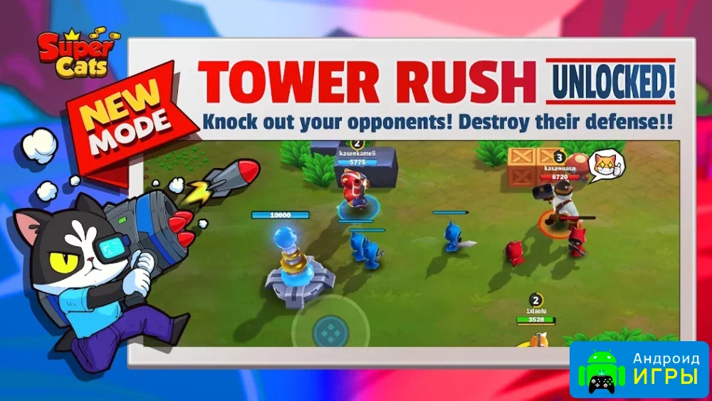 Super Cats — это весёлый многопользовательский экшен для устройств на Android, который перенесёт игроков в мир забавных, но отважных котиков. Здесь вас ждут стремительные командные сражения формата 3 на 3, море драйва и ярких эмоций. Присоединяйтесь к миллионам игроков, выберите своего героя и докажите, что именно ваш кот достоин звания лучшего бойца арены!
