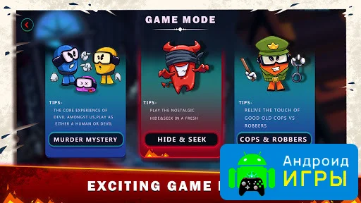 Разработчики подготовили несколько оригинальных игровых форматов, каждый из которых имеет собственные правила и атмосферу. Игрокам доступны три режима:- тайное убийство. Классическая механика поиска предателя, где один или несколько участников становятся дьяволами, а остальные должны вычислить их, прежде чем погибнут все;