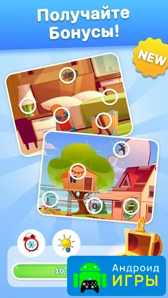 Если вдруг какое-либо отличие трудно найти, в игре предусмотрены полезные бонусы: подсказки помогут определить место различия, а функция остановки времени даст возможность внимательно изучить обе картинки, не торопясь и не теряя результат.