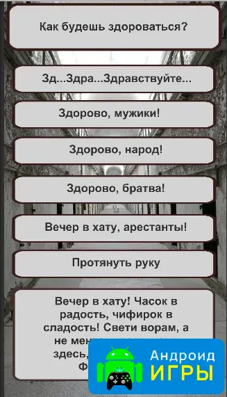 Тест предлагает игрокам разнообразные вопросы, которые позволяют оценить свою смекалку, хитрость и способность «выживать» в сложных условиях. Каждый вопрос связан с реальными ситуациями, которые могут возникнуть в тюремной среде, что делает игру не только развлекательной, но и немного познавательной.Особенности
