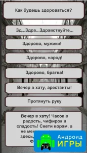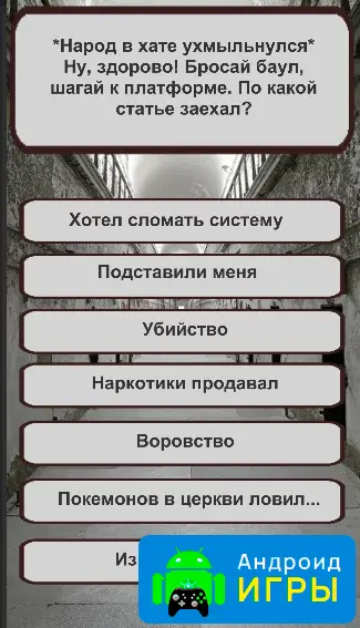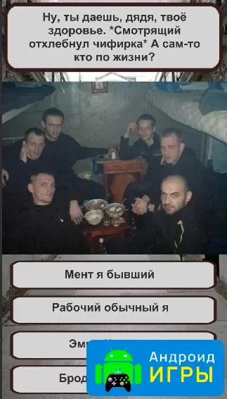 Суть приложения предельно проста: игрок отвечает на вопросы, которые построены так, будто вы только что оказались в заключении. Вопросы разработаны в стиле тюрьмы и могут быть очень дерзкими или неожиданными, заставляя вас задуматься перед каждым выбором. От ответов зависит итоговый результат — ваше тюремное звание.Всего в игре 16 различных концовок, что делает прохождение теста интересным и многоразовым. Вы можете заполнять анкету столько раз, сколько захотите, пробуя разные варианты ответов и наблюдая, как меняются результаты. Несмотря на простоту интерфейса, вопросы сделаны живо и с юмором, что позволяет игроку полностью погрузиться в атмосферу игры и получить удовольствие от процесса.