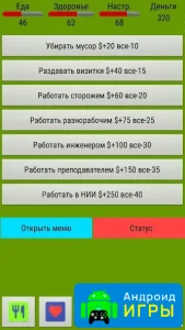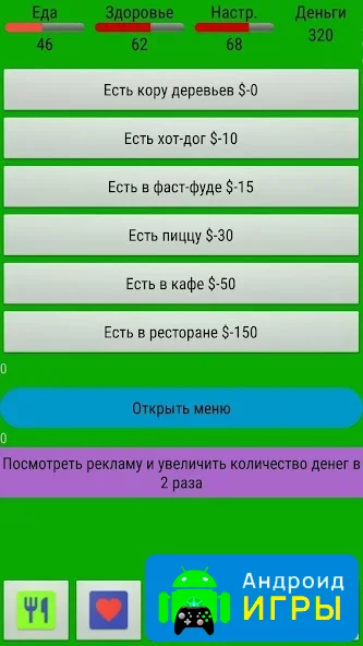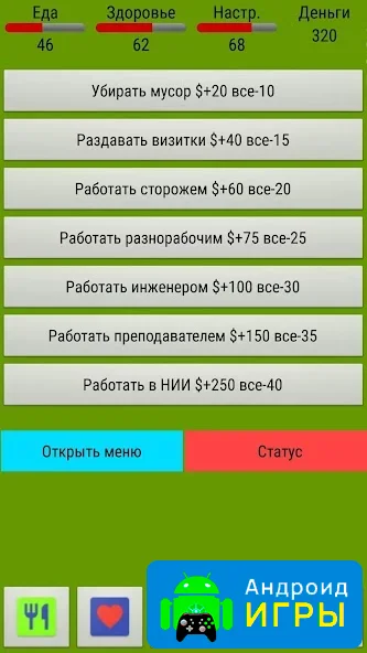 Важными показателями, за которыми необходимо следить, являются настроение, здоровье и еда. Поддерживайте их на оптимальном уровне, чтобы персонаж оставался активным и успешно развивался. Сможете ли вы подняться до вершин богатства и успеха, или ограничитесь скромной жизнью — решение остается за вами.