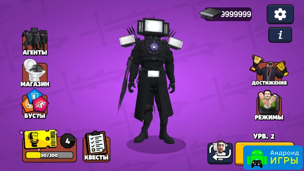 Каждое сражение начинается с выбора стороны: станете ли вы агентом или скибиди-туалетом. Смена роли возможна в любой момент одним нажатием. Красная шкала отображает здоровье, а желтая – уровень энергии. Для атаки необходимо хотя бы одно деление энергии. На экране также видно количество врагов, которых нужно победить на текущем уровне. Дополнительно можно опробовать специальные режимы: фарм чипов или бой с G-man, а ежедневные задания и награды делают игровой процесс ещё интереснее.Разнообразие задач и улучшений