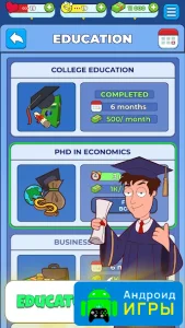 В игре представлено множество способов заработать: от торговли на бирже и инвестиций до азартных развлечений, таких как казино. С течением времени вы сможете приобрести роскошный дом, автомобиль мечты, самолёт, а также обеспечить себе комфорт с прислугой и развлечениями. Поступление в институты и дополнительные курсы повышает доход, а создание семьи и забота о здоровье добавляют реалистичности. Не забывайте о досуге: бассейн, боулинг, концерты и бильярд помогут поддерживать баланс между работой и отдыхом.Idle Guy: Симулятор Жизни — это игра, где каждое ваше решение формирует личное будущее, превращая мечты в реальность.