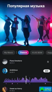 Также здесь есть разные эффекты, которые могут удивить каждого. Попробуйте огромный перечень фильтров с разными цветами. При этом некоторые из них являются анимированными. Ещё воспользуйтесь эмодзи, которые будут хорошо сочетаться с текстами. Если видео уже было отредактировано, то можно приступить к наложению музыки. Аудио является лицензированным и представлено в широком разнообразии, поэтому любой сможет найти для себя песню, в зависимости от личных вкусовых предпочтений.