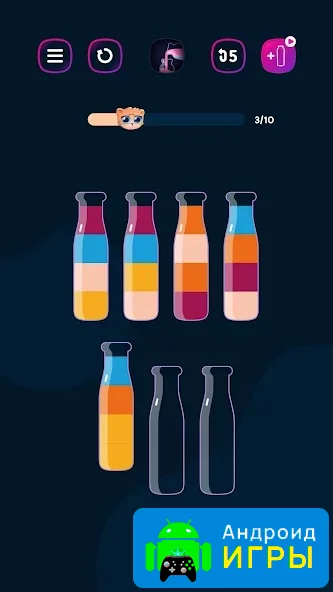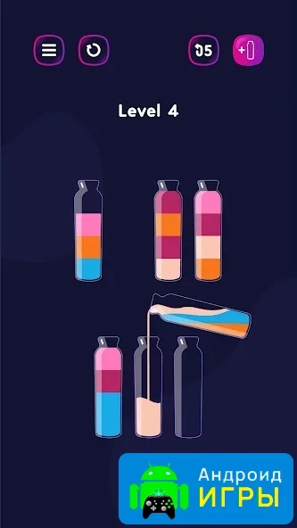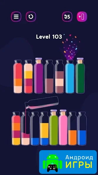 В игре вам предстоит управлять набором пробирок с разноцветными жидкостями. Каждая пробирка может содержать несколько слоёв разных цветов, которые нельзя смешивать между собой. Ваша задача — аккуратно переливать жидкости, чтобы собрать их в отдельные пробирки по цвету. Неосторожный шаг или неправильное сочетание приведут к ошибке, а успешные действия откроют новые пробирки и уровни с возрастающей сложностью. С каждым этапом количество пробирок и разнообразие жидкостей увеличивается, а логика игрока подвергается настоящему испытанию.Динамика и сложность уровней