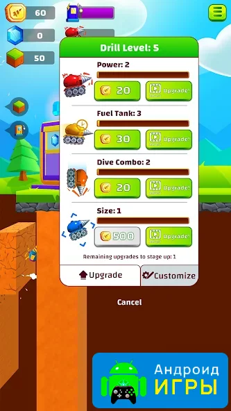Ground Digger для Android — это увлекательный казуальный проект, который перенесет пользователей в захватывающее путешествие под поверхность нашей планеты. Здесь вам предстоит взять под контроль специальный бур и начать спуск сквозь различные слои Земли, чтобы достигнуть её ядра. Игра отличается свободным геймплеем: уровней или конкретных заданий нет, пользователи самостоятельно исследуют недра, добывая ценные ресурсы и находки.