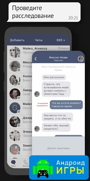 Sentence — это захватывающий психологический триллер для устройств на Android, который переносит игрока в небольшой городок, охваченный страхом и тайнами. Серийный убийца терроризирует жителей, а вам предстоит распутать сложное дело и понять, кто скрывается за чередой преступлений. Игра сочетает интригующий сюжет, свободу действий и глубокую интерактивность, погружая в атмосферу настоящего детективного расследования.