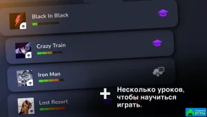 Отметим, что пользователю даже не нужно иметь свой инструмент, ведь тут встроена виртуальная электронная или бас гитара. Используя простые наэкранные кнопки, можно извлекать реальные звуки и создавать из них свои композиции. Если у пользователя вообще отсутствует опыт, тут есть встроенные обучающие материалы. В них указаны основные аккорды, виды перебора, информация про наиболее удобный способ ввода и так далее. Освоить базовый навык можно за очень короткий промежуток времени, что подойдёт новичкам. А виртуальная гитара поможет понять, насколько вообще интересен процесс музицирования.
