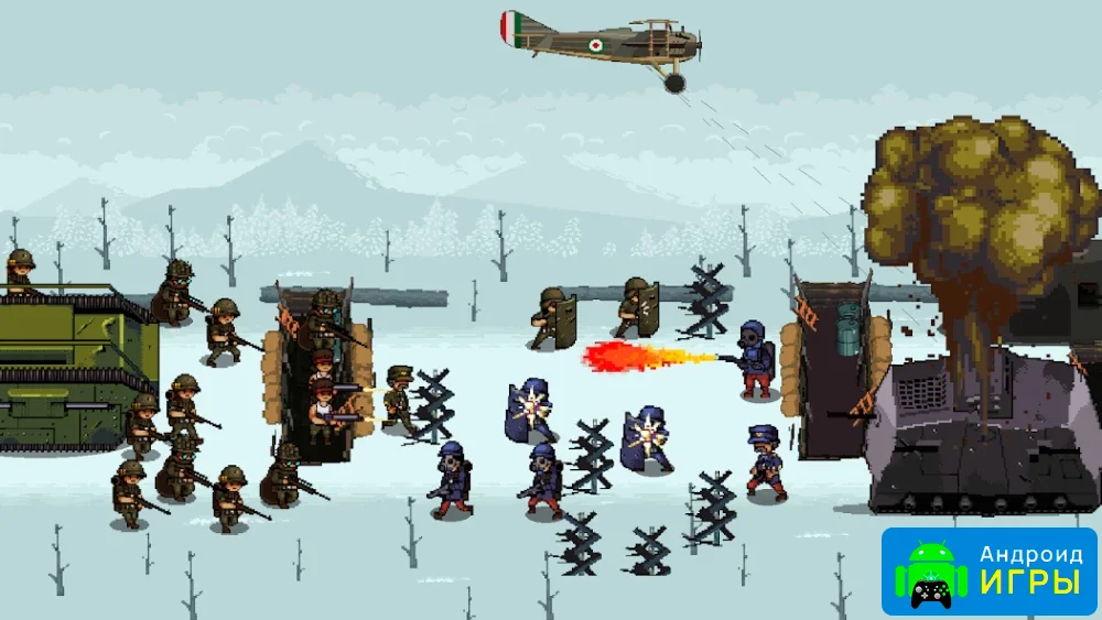 Проходя сюжетную кампанию, вы погружаетесь в события Первой мировой войны. Игра включает большое количество уникальных уровней с разнообразными локациями, где вас ждут разные типы врагов с особыми навыками и вооружением. Используйте тактическое мышление, чтобы наносить ракетные удары, вести артиллерийский огонь, применять пулеметы, дробовики и огнеметы. Побеждая врагов, вы получаете монеты, награды и достижения, которые помогут прокачивать армию и открывать новые возможности.Развитие армии