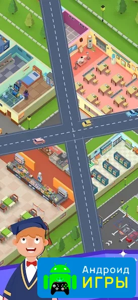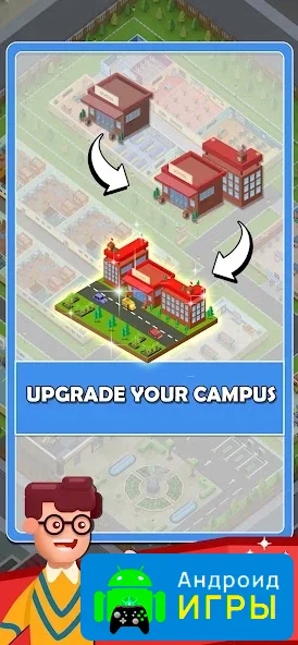 Игра радует насыщенной и красочной графикой в HD-качестве с полностью трёхмерным оформлением. Камера расположена сверху, что обеспечивает удобное управление и лёгкую навигацию по кампусу. Визуальные эффекты делают процесс строительства и развития колледжа ещё более захватывающим. Управление простое и интуитивное, благодаря чему игру можно комфортно проходить одной рукой, получая удовольствие от каждого этапа развития учебного заведения.Скачайте Idle School Tycoon прямо сейчас и станьте архитектором и директором собственного учебного заведения. Развивайте колледж, выполняйте задания, создавайте уникальные интерьеры и превращайте простое здание в лучший колледж, где студентам будет комфортно и интересно. Игра подарит часы увлекательного геймплея, подходящего для игроков всех возрастов.