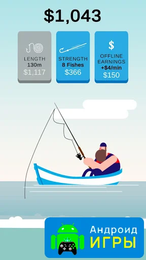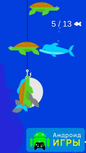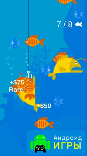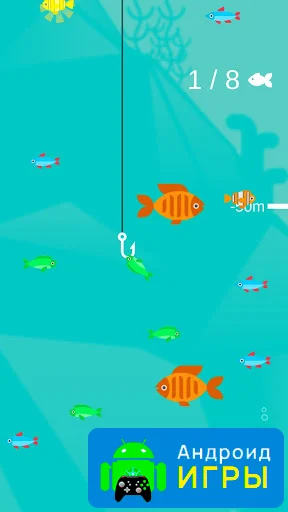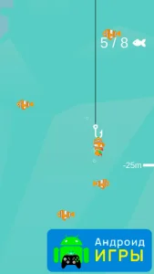 Игровая механика очень интуитивная: закидывайте крючок на глубину, регулируйте траекторию, чтобы поймать максимальное количество рыбок. Леску тянет сам персонаж, а ваша задача — направлять крюк к рыбе. Вверху экрана отображается цель: количество рыб, которое нужно поймать за сеанс. Каждое успешное действие приносит награду, которую можно потратить на улучшение оборудования. Такой подход делает игру медитативной, но в то же время увлекательной, удерживая внимание игрока на процессе.Улучшение снастей