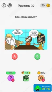 Игра разделена на 11 уникальных глав, каждая из которых предлагает свои особенности и задания: викторины о кино, логотипах, городах и музыкальных группах, головоломки «Найдите лишнее», «Заполни пропуск», «Шопомания» и сопоставление эмодзи. Викторины состоят из нескольких вопросов, и при ошибке игрок может попробовать пройти уровень повторно, иногда за просмотр рекламы. Кроме того, на определённых уровнях можно получать таинственные подарки и бонусы, что добавляет элемент неожиданности и азарта.Развитие интеллекта и дополнительные возможности