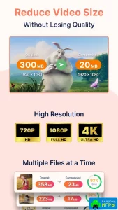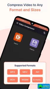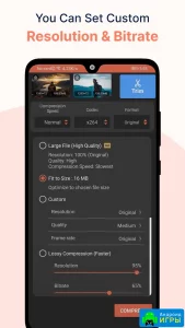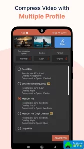 Compress Video Size Compressor представляет собой уникальный мобильный клиент, который можно скачать на все устройства под управлением операционной системы Android. Его главная задача заключается в том, чтобы конвертировать и сжимать любые видеоформаты в высоком качестве. Чтобы начать работу над контентом, нужно скачать сжатый файл. У нас на сайте есть взломанная версия, скачав которую можно получить доступ к разблокированному премиуму.