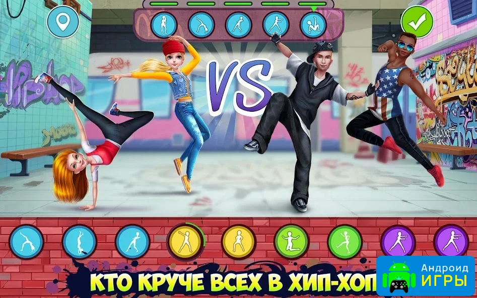 Хип-хоп битва: девушки VS парни — это яркий ролевой проект для Android-устройств, в котором уличные танцы превращаются в настоящее соревнование характеров. Игра предлагает окунуться в атмосферу городских баттлов, где стиль, харизма и чувство ритма решают всё. Здесь каждый поединок — это шанс заявить о себе и доказать, чья команда достойна уважения.