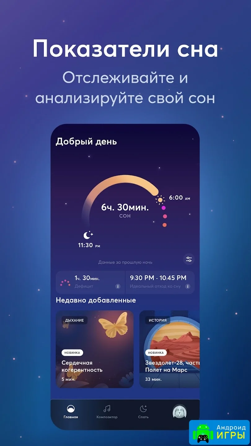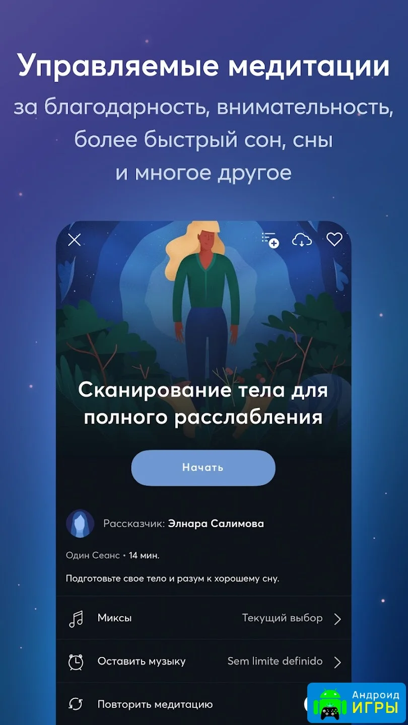 Приложение предлагает инструменты для медитации, которые помогают снизить стресс и улучшить эмоциональное состояние. Пользователь может настраивать таймеры, создавать плейлисты с любимыми треками и подбирать звуки для релаксации.Дополнительные функции позволяют следить за качеством сна и анализировать его продолжительность. Это помогает лучше понимать собственные привычки и работать над улучшением режима отдыха.