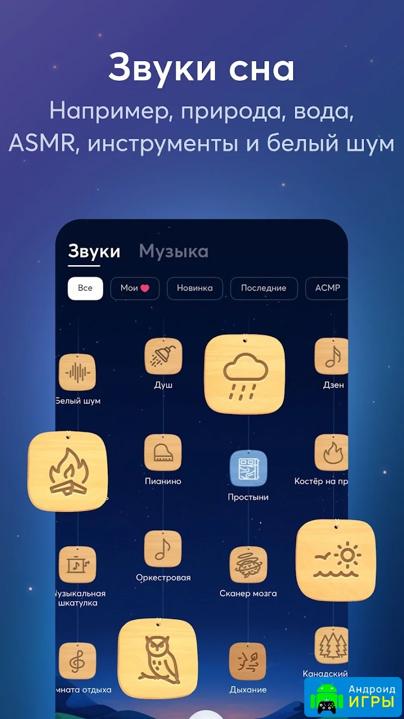 Основная цель приложения — помочь пользователям наладить сон и избавиться от проблем с засыпанием. Специальные звуковые и медитативные практики способствуют расслаблению и снижению уровня стресса.Приложение может помочь справиться с тревожностью, головными болями и эмоциональным напряжением. Регулярное использование инструментов релаксации способствует улучшению общего самочувствия и созданию комфортных условий для отдыха.
