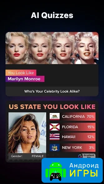Главная особенность Gradient — возможность улучшения внешнего вида лица на фотографиях. Пользователи могут корректировать форму губ, глаз, носа и других черт, изменять цвет волос и подбирать идеальные пропорции. Кроме классических функций ретуши, приложение предлагает уникальные творческие возможности: превращение себя в фантастических персонажей — эльфов, драконов или мультяшные версии самого себя. Такие трансформации можно сохранять и показывать друзьям, вызывая удивление и восторг.Особое внимание уделено функции этнического анализа. Приложение с помощью AI определяет возможное происхождение человека, указывая на национальные корни и предполагаемых предков. Это добавляет интерактивности и делает процесс редактирования ещё более познавательным.