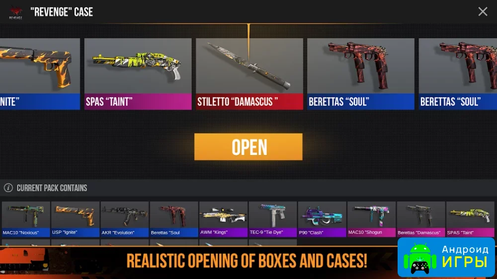 Главная цель игрока — пополнять свой виртуальный инвентарь редкими и ценными предметами. Каждый полученный скин можно рассматривать в 3D под разными углами, чтобы рассмотреть все детали. Чем больше кейсов вы откроете, тем выше шанс получить универсальные и легендарные предметы. Помимо стандартного оружия, игроки могут находить ножи, брелоки и подвески, добавляя разнообразие в коллекцию и повышая азарт открытия новых кейсов.Игра включает уже 5-й сезон, предоставляющий свежие коллекции Fireborn и Revenge, а также новые пистолеты Dual. Любой дубликат можно продать на виртуальном рынке, чтобы приобрести больше кейсов или собрать всю коллекцию полностью. Каждая коробка открывается эффектно благодаря качественным визуальным эффектам и продуманным анимациям.