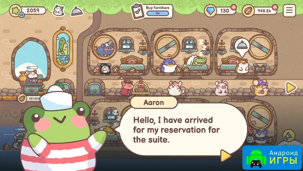 Кроме того, важно нанимать новых работников, которые помогут обслуживать клиентов и поддерживать порядок. По мере прохождения открываются дополнительные функции, новые комнаты и разнообразные предметы интерьера — картины, украшения и другие элементы декора. Игроки смогут общаться с гостями, узнавать их истории и наслаждаться спокойной атмосферой игры.Проект радует красочной графикой, милыми персонажами и расслабляющим игровым процессом, который позволяет приятно провести время.