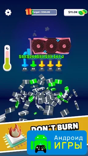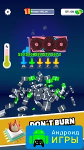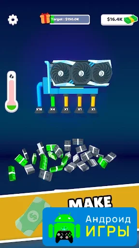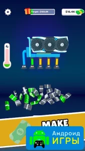 В игре представлен специальный стенд с видеокартой, от которого отходят трубы, символизирующие поток прибыли. Именно из них на экран буквально «сыплются» доллары и монеты. Механика предельно проста: достаточно удерживать палец на экране смартфона, чтобы запустить настоящий денежный дождь и пополнить игровой баланс.Make Cash можно бесплатно скачать и начать зарабатывать виртуальные средства уже с первых минут. Постепенные улучшения оборудования, быстрый рост дохода и простое управление делают игру отличным вариантом для любителей кликеров.