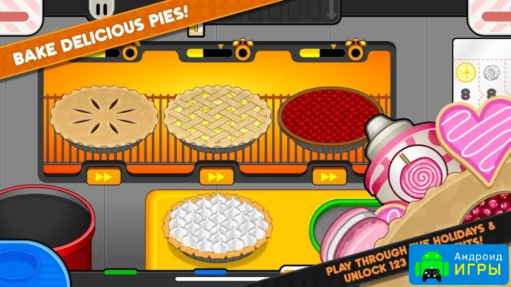 Игра предлагает большое разнообразие игровых уровней и посетителей, каждый из которых имеет свои предпочтения и характер. Всего вас ждут 126 уникальных гостей, а чтобы удовлетворить их ожидания, придется внимательно следить за их желаниями и вкусовыми предпочтениями. Кроме того, в ходе игры можно организовать около 12 праздничных событий, приготовив огромное количество пирогов и открыв для себя 40 новых рецептов. За успешное выполнение заданий игрок получает 90 уникальных стикеров, которые станут символом мастерства и прогресса.Особенности