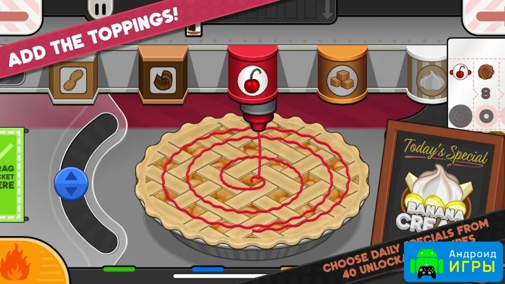 Ваша цель — сделать кафе самым популярным в городе. Для этого необходимо создавать уникальные рецепты пирогов, комбинировать различные начинки и украшения, чтобы удивлять клиентов и поддерживать интерес к заведению. С каждым днем количество посетителей растет, а вместе с этим растет и сложность работы. Только умелое планирование, скорость и креатив помогут справиться с наплывом заказов и сохранить высокий уровень сервиса.Множество гостей и событий