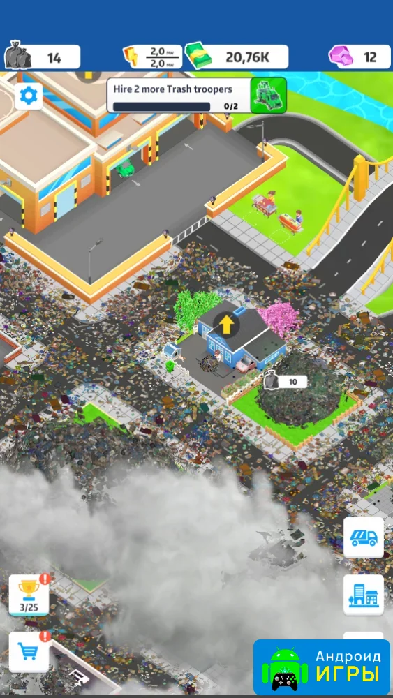 В начале игры доступен лишь небольшой набор техники и базовые возможности. Игрок арендует мусоровозы, отправляет их на сбор отходов и постепенно улучшает их характеристики — скорость работы, вместимость и доходность. Чтобы эффективно управлять отходами, необходимо строить и развивать свалки, расширяя их возможности и увеличивая прибыль.Развитие города и новые объекты