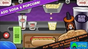 Этот игровой проект наполнен огромным количеством уровней, где нужно одновременно выполнять несколько задач. Помимо приготовления сосисок и запекания булок, нужно будет приготовить попкорн и многое другое. Вам нужно будет научиться делать всю работу одновременно, чтобы гости успели получить свой заказ.