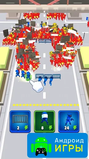 Проект выполнен в формате таймкиллера и подойдёт игрокам любого уровня. Играть можно в любое время, постепенно проходя уровни и улучшая свои навыки. Основная задача — сдерживать напор толпы и не дать ей прорваться дальше. Для этого необходимо взаимодействовать с полицией, которая помогает контролировать ситуацию. В сложных моментах можно подключить дополнительные силы, чтобы стабилизировать обстановку и сохранить контроль над городом.Простая механика и развитие