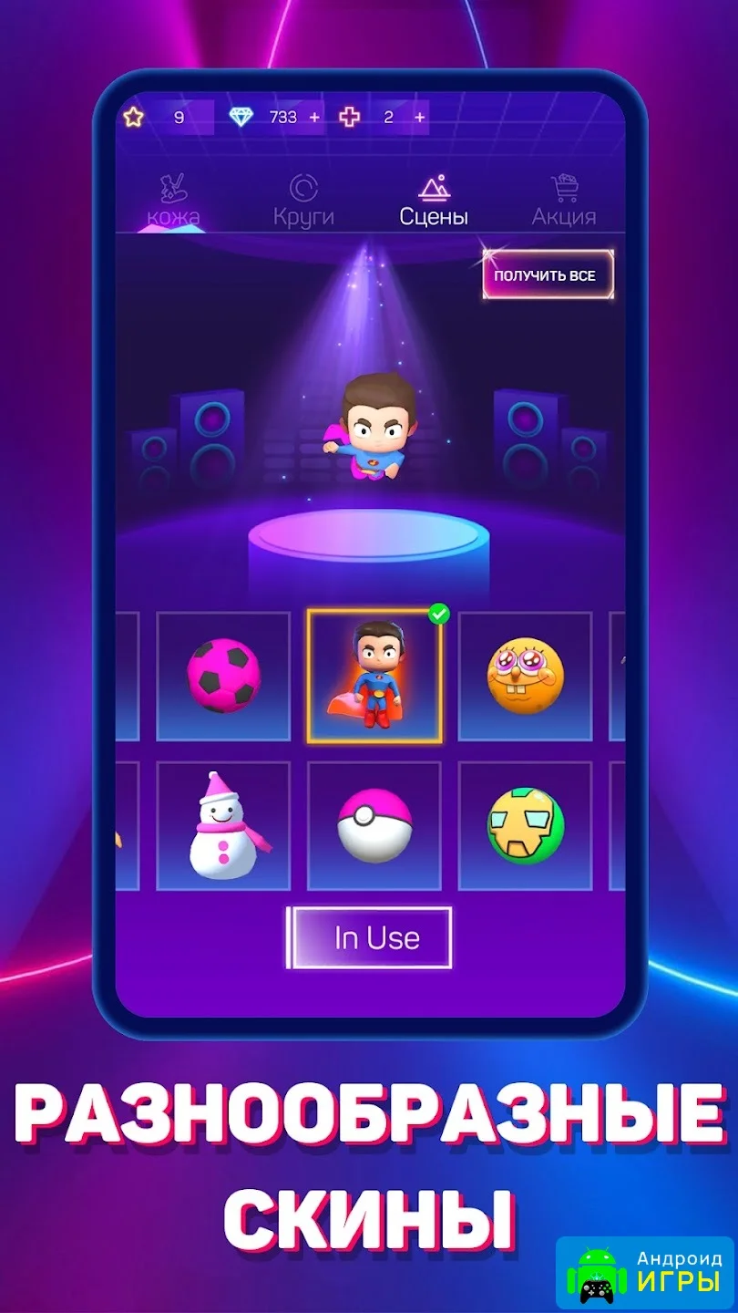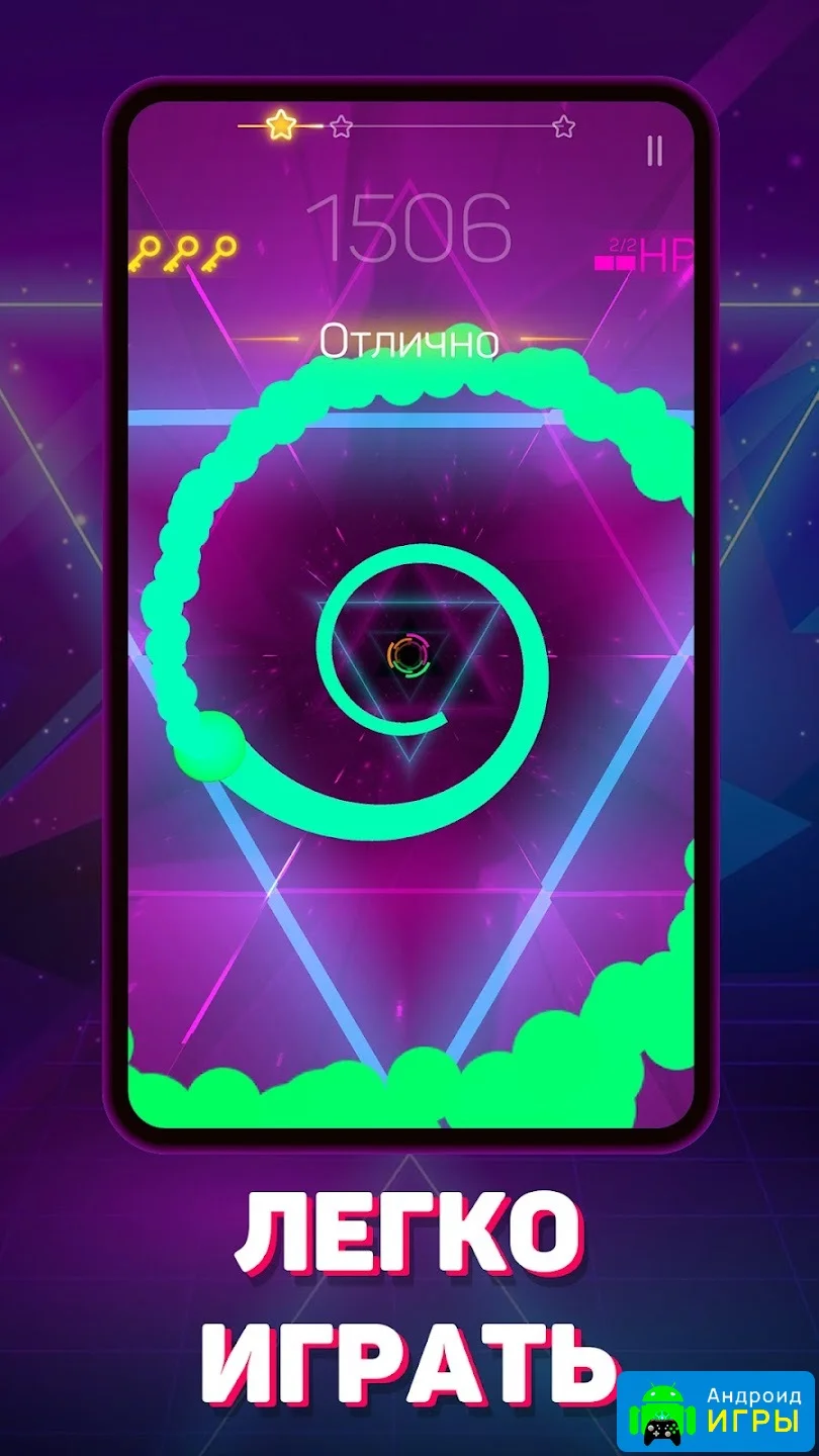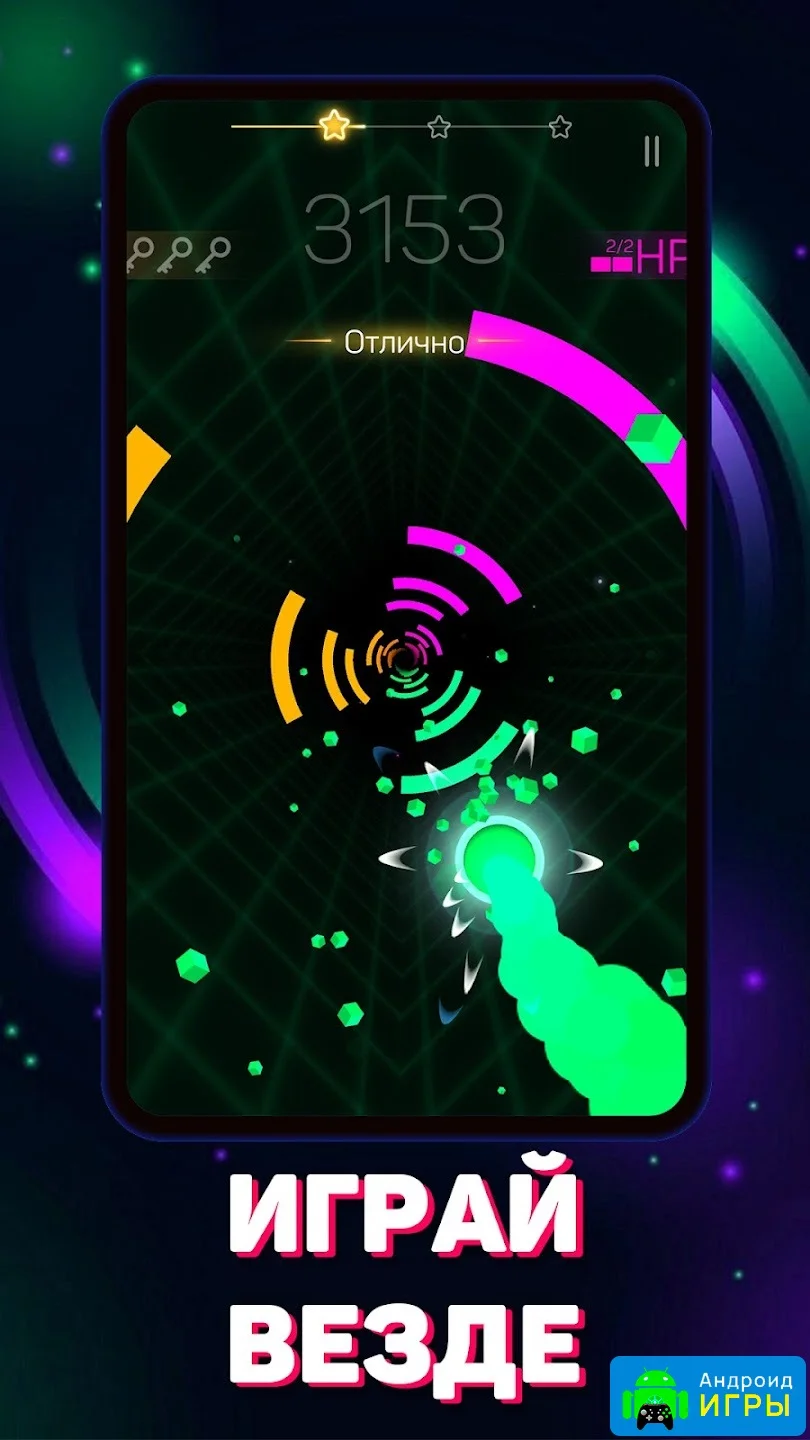 Игра ориентирована на одного пользователя и отлично подходит для коротких игровых сессий. Управление максимально понятное: достаточно водить пальцем по экрану, направляя шар и разрушая музыкальные элементы. Важно внимательно следить за цветами, избегать ошибок и не пропускать объекты. Основная задача — двигаться в ритме и удерживать темп, чтобы успешно проходить уровни. Благодаря динамике и визуальным эффектам процесс быстро затягивает и мотивирует улучшать результаты.Лёгкий геймплей и разнообразие