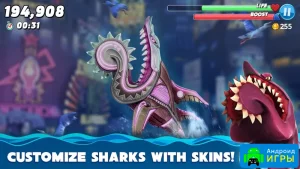 В этой игре не нужно придерживаться какого-то определённого плана, а стоит лишь подстраиваться под происходящее. При помощи монет вы сможете улучшать свою акулу. Например, можно увеличить скорость, силу укуса и иные показатели. Если же улучшений будет недостаточно, то можно будет приобрести дополнительное оружие и конкретный скин.