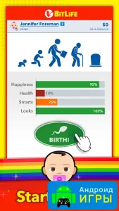 BitLife - Life Simulator представляет собой популярную игру своего жанра, где вам нужно прожить жизнь за определённого персонажа. То есть, вам требуется создать собственного героя, а после отправится в большой мир, который может потребовать от вас конкретного выбора в самый рандомный момент. Этот проект можно скачать на все гаджеты, которые работают на базе операционной системы Аndroid. Взломанная версия с модом на всё разблокировано доступна на нашем сайте.
