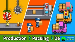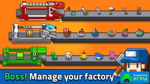 Основная суть этой игры заключается в том, чтобы управлять фабриками и создавать новые производственные предприятия. Начинайте с небольших бизнес-сооружений и расширяйтесь на постепенной основе. Устанавливайте конвейеры, осваивайте изготовление разных предметов и продавайте готовый товар для получения прибыли. Заработок можно потратить на покупку разных ресурсов и предметов.Не стоит растрачивать деньги впустую, так как целесообразнее будут вкладывать их в развитии бизнеса и строительство персональной империи. Покупайте разные улучшения, устанавливайте оборудование и станки. Очень важно автоматизировать производственные процессы и нанимать новых сотрудников. Сделайте абсолютно всё для повышения продуктивности и открытия новых возможностей.