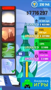 Rocket Sky! Является интересной аркадой, где вам нужно будет заниматься возведением персональной ракеты и постараться запустить её как можно на большую высоту. Она распространяется на все устройства, которые находятся под управлением операционной системы Андроид. А у нас на сайте доступна взломанная версия, которая предоставляет бесплатные улучшения.