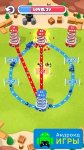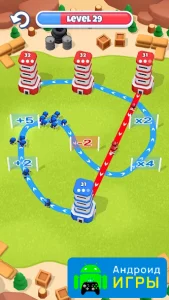 В этой игре разработчики уготовили для вас многочисленные уровни. В абсолютно всех из них нужно захватывать башни. На каждой локации будут расположена одна синяя башня, а также красные и серые строения. Постройка синего цвета является вашей базой, где будут располагаться войска. На башнях отображается количество защитников, от которых нужно избавиться для получения постройки. На большой башне также будет отображаться количество, так что нужно будет защищаться.Сделайте всё, чтобы воины не закончились при нападении или защите. Желательно изначально захватывать слабый башни для увеличения мощности, после чего отправлять воинов к мощным объектам. Кроме башен, локации будут наполнены объектами, благодаря чему геймплей становится гораздо увлекательнее. Оттенки башен могут быть и другие, однако это никак не влияет на механику. После переходите к более сложным испытаниям. Не забывайте задействовать мозг для придумывания эффективных тактик.
