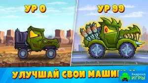 В ходе игры вы будете собирать бонусы и валюту, которую можно потратить на улучшение своего транспорта. Вооружите машину пушками, бронированными деталями и другими смертоносными элементами, которые помогут вам справляться с препятствиями гораздо быстрее. Следите за уровнем здоровья автомобиля, ведь если он опустится до нуля, придётся начинать всё сначала.