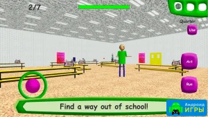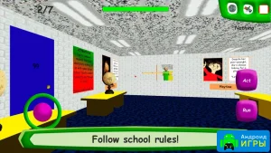 Baldi's Basics in Education — это необычная игра для мобильных устройств, которая предлагает пользователям погрузиться в школьную атмосферу с нестандартными испытаниями. На этот раз вам предстоит вместе с главным персонажем оказаться в образовательном учреждении, где каждое помещение скрывает новую головоломку, отличающуюся от предыдущих. Задания спрятаны в разных комнатах, и чтобы получить доступ к ним, необходимо сначала найти ноутбук, на котором и будут отображены задачи.