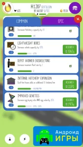 Egg, Inc. — это увлекательный и забавный симулятор для устройств на Android, в котором вы сможете развить свою собственную птицеферму и отправиться в захватывающее путешествие к успеху. В этой игре вы не просто будете собирать яйца, ведь вы создадите высокотехнологичное предприятие будущего. На нашем сайте есть возможность загрузить взломанную версию с большим количеством денег.